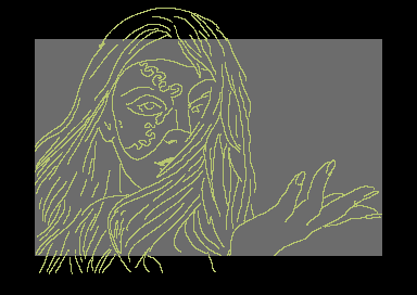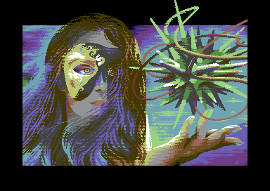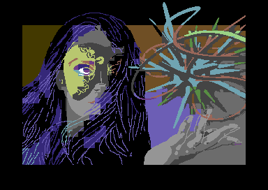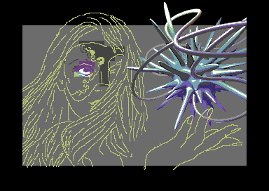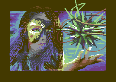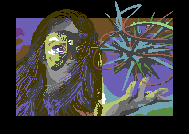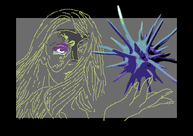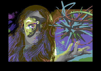 Commodore 64 quarter char hires (QCH) image with sprites, 2023. Coding by Copyfault/Extend ^ Dienstagstreff ^ The Obsessed Maniacs ^ The Solution. 11 sprites.
